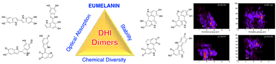 真黑色素(拉丁语:Eumelanin),亦作真黑素,是一种生物色素,属于黑色素的一种,是酪胺酸经过一连串化学反应所形成,动物、植物与原生生物都有这种色素,在生物体中具有光保护的作用。真黑素由 5,6-二羟基吲哚 (DHI)的低聚物构成,然而,目前真黑色素详细的微观分子结构还不清楚,这限制了人们对其在生物体系中功能的理解,同时也限制了真黑色素在材料科学中的潜在应用。为了揭示其结构稳定性和吸收光谱之间的关系,课题组系统研究了最小寡聚体二聚体所有可能的异构体,建立了一个由 830个DHI二聚体组成的虚拟数据库,发现氧化的多环结构有利于形成较大的类石墨结构低聚物,并提出了电环形成机制;发现稳定的氧化二聚体的吸收能可低至1.3 eV。它们可能以亚结构形式存在于天然低聚物中,并有助于生物聚合物的吸收光谱。
