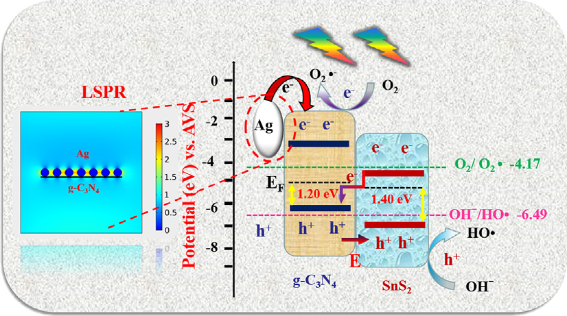 本研究利用在2D Ag-C3N4纳米片上原位形成3D花状SnS2微球。该催化剂的光催化性能在可见光照射下,通过光催化分解水制氢和光催化降解四环素(TC)对样品进行了系统研究。作者猜测光催化性能的提高归因于Ag C3N4/SnS2样品的局域表面等离子体共振(LSPR)效应可以有效提高样品可见光区域的吸收率,并且异质结结构具有有效的界面电荷迁移和分离能力。