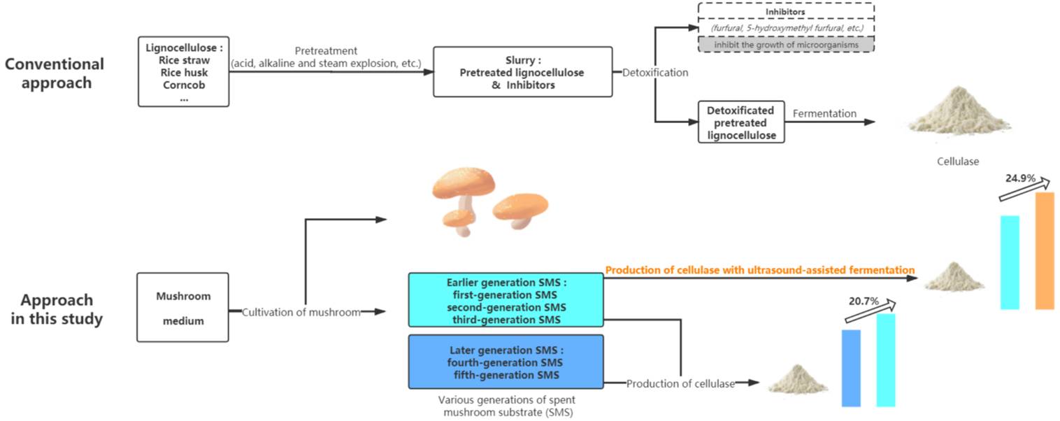 预处理和脱毒工序是利用木质纤维素生产纤维素酶中必不可少的过程。废弃蘑菇菌糠因其在蘑菇培养基制备期间经过高温处理和蘑菇生长阶段类似于生物预处理的过程后,结晶度降低,具有用于纤维素酶生产而无需预处理和脱毒的潜力。本研究分别直接利用黑木耳、毛木耳和平菇各代菌糠发酵产纤维素酶,结果显示前代菌糠的纤维素酶产量高于后代菌糠,其中利用平菇第三代菌糠获得了最高3.51 U/mL纤维素酶活;比较了各代菌糠中木质纤维素成分变化,其中毛木耳的木质素降解能力最强,黑木耳的纤维素降解能力最强。研究还表明,在发酵过程中使用超声波处理可以提高纤维素酶活性,在发酵4 d后以0.8占空比下超声波处理40 min,纤维素酶产率提高了~25%。本研究不仅为处置废弃菌糠提供了一种可能的解决方案,而且提出了一种用于纤维素酶生产无需预处理脱毒的潜在底物。