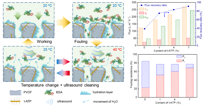 在这项研究中,本文报道了一种具有热敏性的凹凸棒石(t-ATP)改性的PVDF膜。将热敏材料接枝到ATP表面获得t-ATP,然后和PVDF共混制备分离膜。t-ATP表面的热敏性高分子链在不同温度下表面出伸缩特性,可以吸收或者释放膜界面处的水分子。在温度切换过程中,配合低功率超声波极易打破粘附在膜表面的BSA污染层,可以显著提高膜通量,经过简单的清洗处理就能去除89%以上的BSA污染,从而避免了膜清洗过程中使用酸碱试剂或使用高强度超声波。