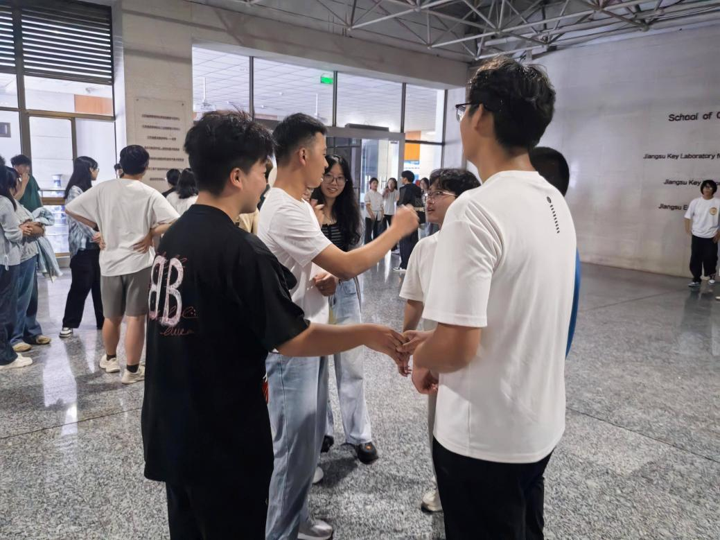 热身环节率先打破僵局。“生日接龙”环节中,新生们通过表情、动作等非语言方式传递生日信息,按顺序排列成队,同月同日生的巧合频频引发阵阵惊喜;“轻柔体操”则通过互助捶背、捏肩的肢体互动,打破了相处中的疏离感。分组互动环节进一步深化了交流。“三生有幸”中,新生们主动分享各自的三个优点,在同伴的复述与肯定中逐渐增强自信;“相似圈”环节,从“喜欢实验操作”到“关注化学前沿”的共同兴趣表达,让新生们在专业相关话题中迅速找到共鸣。而“心有千千结”游戏将活动推向高潮,各小组协作拆解交错的“手链”。在一次次尝试与配合中,切实体会到“团结就是力量”的深刻内涵。