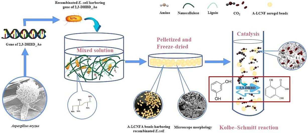 2,6-二羟基苯甲酸(2,6-Dihydroxybenzoic acid,2,6-DHBA)是重要的化工中间体,由酚类单体经科尔贝-施密特羧化反应获得。生物法催化的2,6-DHBA羧化合成可有效避免化学法合成副产物多且环境污染的缺点,但产量较低。米曲霉(Aspergillus oryzae)2,3-二羟基苯甲酸脱羧酶(2,3-Dihydroxybenzoate decarboxylase,2,3-DHBD_Ao)可有效推动羧化反应,实现2,6-DHBA高效生物合成。为进一步提高转化率,本研究制备了一种新型氨基修饰和木质素掺杂的纤维素纳米晶气凝胶(Amino-modified and lignin-doped cellulosenanocrystal aerogel,A-LCNCA)。该气凝胶具有独特的高比表面积和CO2捕集能力,是良好的2,3-DHBD_Ao固定化材料。结果显示,2,3-DHBD_Ao@A-LCNCA催化的羧化转化率较游离酶提高了45.1%,可耐受更大范围的反应温度和底物浓度,储存30天后仍可保留55%的活性,实现了2,3-DHBD_Ao的高活力循环利用。该研究表明,2,3-DHBD_Ao@A-LCNC具有显著的工业应用前景,为2,6-DHBA绿色合成提供了重要的方法指导。