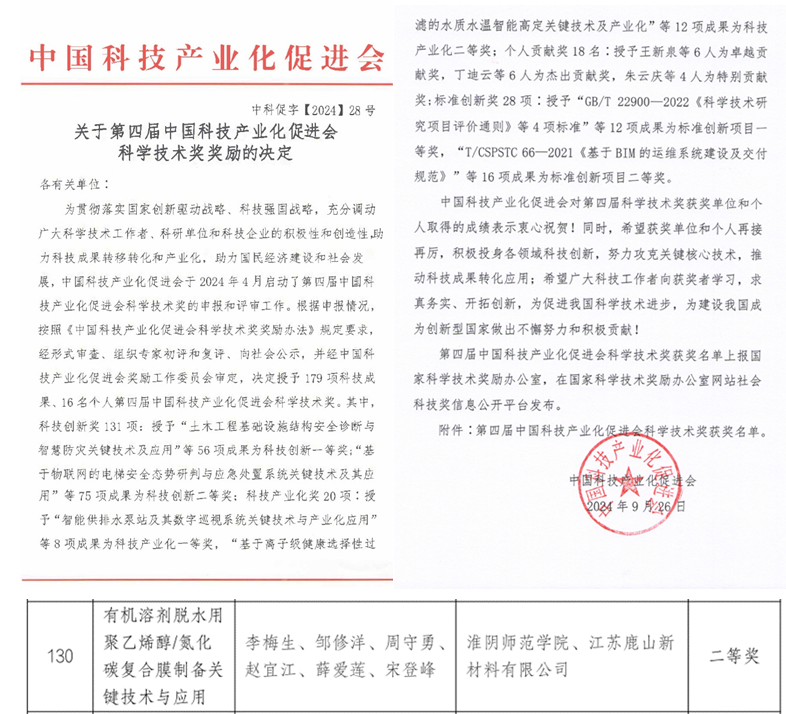 9月26日,中国科技产业化促进会中科促字(2024)28号《关于第四届中国科技产业化促进会科学技术奖奖励的决定》文件发布,yd222云顶线路检测“先进膜材料与膜过程”团队(获奖人:李梅生、邹修洋、周守勇、赵宜江、薛爱莲、宋登峰)牵头的《有机溶剂脱水用聚乙烯醇/氮化碳复合膜制备关键技术与应用》荣获2024年度第四届中国科技产业化促进会科学技术奖科技创新奖二等奖。