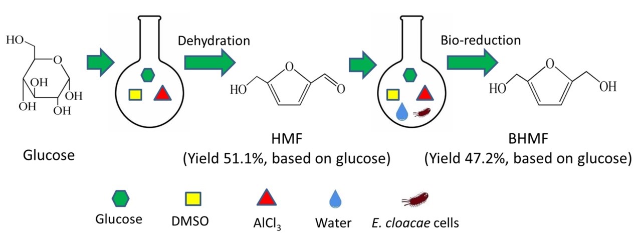 2,5-呋喃二甲醇(BHMF)是一种新型的生物质基聚合材料单体,化学-生物级联催化策略可将廉价葡萄糖转化为高附加值BHMF,其中,解决两种催化体系的兼容性问题是关键。研究团队首先构建了低细胞毒性的AlCl3/DMSO的催化体系,以AlCl3为催化剂,将葡萄糖在DMSO溶剂中脱水制备HMF;然后将反应液稀释,以高鲁棒性的阴沟肠杆菌Enterobacter cloacae HA188为全细胞催化剂,在20%(v/v)DMSO溶剂中原位催化HMF转化为BHMF,优化体系条件后,BHMF得率可达47.2%(以葡萄糖计)。该研究为级联催化法制备BHMF提供了重要参考。
