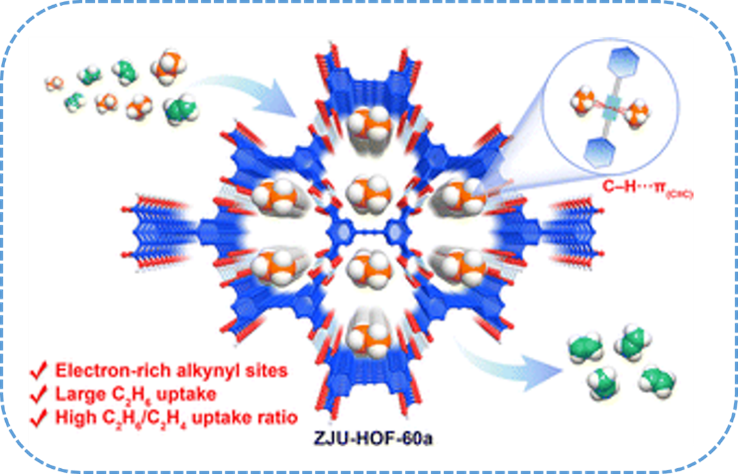 论文二:在HOFs(氢键有机框架)中引入炔基团功能化,能够高效地实现C2H6/C2H4的分离。活化后的ZJU-HOF-60a展示了在296 K和1 bar下,所有已报道的有前景的HOF材料中,最高的C2H6吸附量(3.79 mmol g−1)和C2H6/C2H4吸附比率。本研究为HOF材料的合理设计提供了新的思路,旨在通过引入合适的功能位点来提升气体吸附和分离性能。