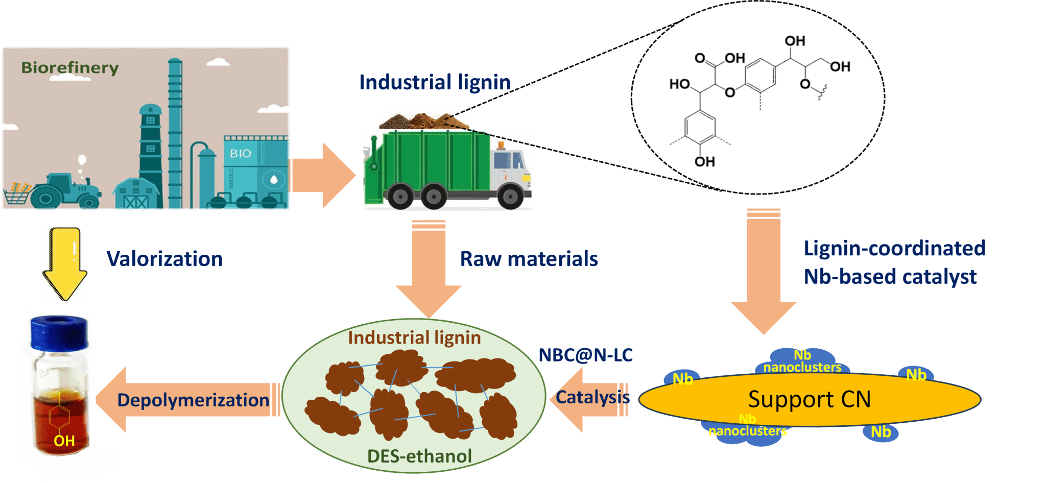 催化解聚是工业木质素高值化利用的有效途径。本研究以工业木质素为碳源,设计合成了一种新型氮掺杂铌基催化剂NBC@N-LC,铌物种在该催化剂中以单原子和原子团簇的形式共存,在氯化胆碱-乳酸-乙醇(DES-ethanol)复合溶剂中可促进工业木质素高效解聚和4-乙基苯酚定向合成(选择性53.6%)。解聚反应过程中,DES作为木质素和解聚中间体的优良溶剂、乙醇作为原位氢供体、NBC@N-LC作为反应位点和活性中心(其中原子团簇可吸附反应底物而单原子具有良好的析氢效果),复合溶剂和催化剂通过协同作用实现了工业木质素的高效解聚和定向转化。与现有木质素解聚方法相比,这项工作在提高生物质以废治废效率以及合成产物的选择性和成本控制方面提供了一种很好的参考。
