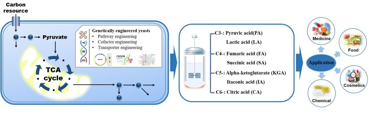 有机酸是一类含有一个或多个羧基(COOH)的化合物,根据美国能源部的数据,它们占已确定的12种糖基化合物的75%,已被广泛用于制药、化妆品、食品和纺织品等化学和生物技术行业。目前,大多数化学品都来自不可生的资源,其不可再生性以及严重的废物污染已经引起了严重的社会和环境问题。因此,通过工业微生物在温和条件下将低成本和可再生资源转化为有价值的化学品变得更加迫切。本文全面总结了微生物合成C3-C6有机酸的最新进展,包括C3型有机酸-酮酸(PA)和乳酸(LA),C4型二羧酸-富马酸(FA),以及二羧酸-琥珀酸(SA,C5型二羧酸-α-酮戊二酸(KGA)和二羧酸-异柠檬酸(IA),C6型二羧酸-酸(CA)。文章系统总结了生物合成和工程改进的最新进展,以生产不同类型的有机酸,如增强rTCA和TCA代谢通量、辅因子调节、抑制副产品形成等;同时论文还讨论了构建酵母细胞工厂、提高微生物有机酸生产性能的策略及未来展望。