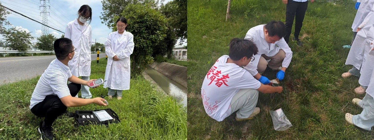在乡村环境调研中,志愿队员走村入户开展垃圾分类问卷调查,精准摸清村民认知水平与实践现状;同步实施“河我一起·净土计划”,在公司专业老师的带领下,志愿者团队采用标准分析方法对采样点水质进行pH值测定,测得水质pH为7.70,并对采集的土壤样品进行预处理,使用无菌采样袋封装带回院实验室检测分析,为乡村环境治理提供数据支持。
