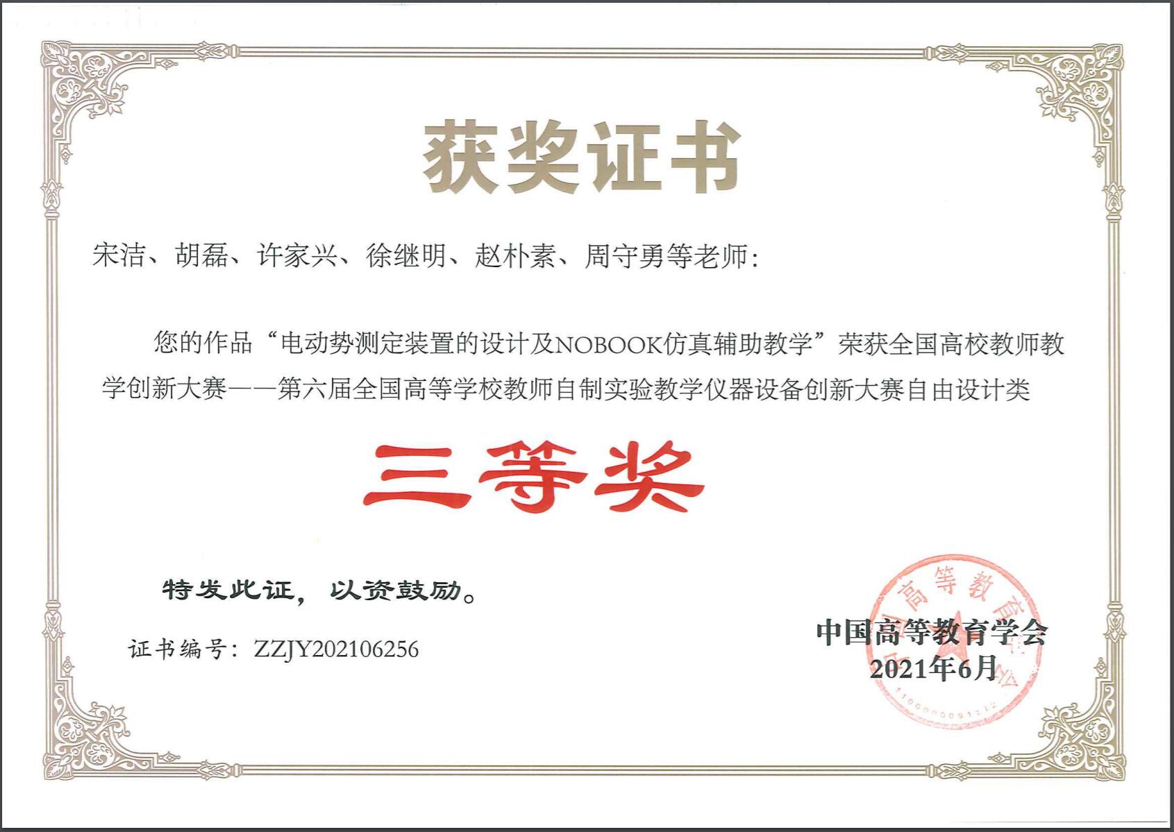 6月18日,中国高等教育学会公布第六届全国高等公司教师自制实验教学仪器设备创新大赛获奖名单,yd222云顶线路检测宋洁团队的《电动势测定装置的设计及NOBOOK仿真辅助教学》作品获三等奖。