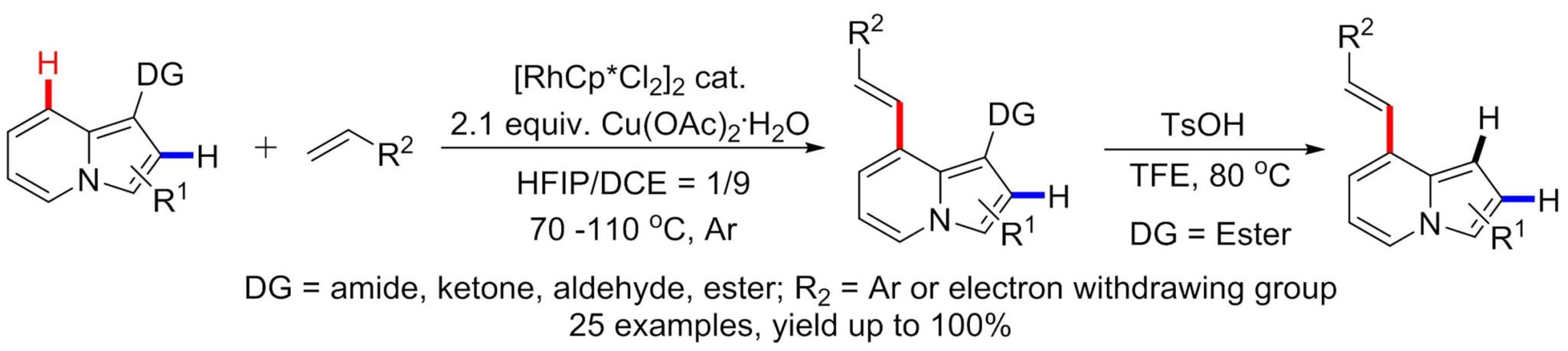 近年来,定位基团促进的过渡金属催化碳氢活化反应受到了有机化学家的极大关注。利用该类方法,可以从自然界中广泛存在的碳氢键出发,选择性的转化为各种官能团。中氮茚环上碳氢键的选择性碳氢活化反应也受到了较多的关注,中外多个课题组开发了多种中氮茚1、3位上的选择性碳氢活化反应。然而中氮茚中吡啶环上的碳氢键选择性活化反应尚未见报道。课题组在前期工作的基础上,成功的利用铑催化实现了中氮茚8位碳氢键的选择性烯基化反应。值得一提的是,常见的铑催化下定位基团导向的碳氢活化反应往往是通过形成五元环金属中间体实现的。而本反应中,反应可选择性的发生在中氮茚的8位上,意味着反应中选择性的生成六元环金属中间体。通过提高催化剂用量和反应温度,可以实现中氮茚2、8位上的选择性双烯基化反应。利用1位酯基作为导向基团时,1位酯基可在温和条件下脱除,从而实现无痕的选择性碳氢烯基化反应。文章链接:https://doi.org/10.1016/j.cclet.2020.02.039