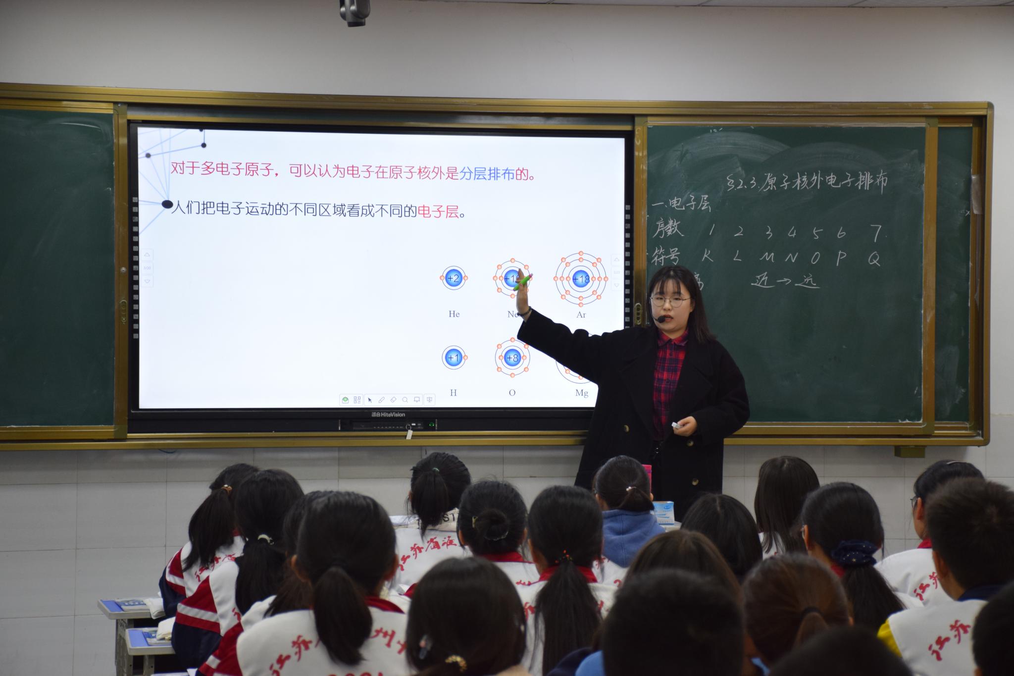 第一环节,2018级实习生孔凡璐同学示范讲课。教学过程中孔凡璐以“卢瑟福的行星模型和玻尔的轨道理论”的化学史内容作为情境线导入本次课“原子核外电子的排布”,以图片展示稀有气体电子的分层排布现象,来提升员工对原子结构及物质性质的认识水平;通过与高一(六)员工的互动强化描述电子层的序数、符号、离核距离和能量高低的具体知识点,再由电子层的学习探究、交流讨论进一步过渡到学以致用的课堂练习。充分体现出员工的主体性和主动性。