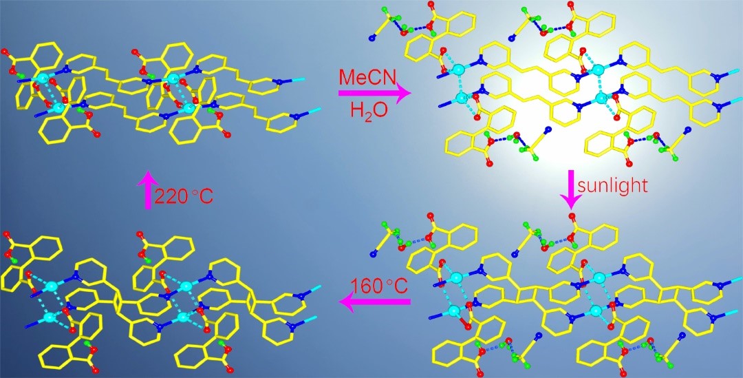 本论文通过银盐与有机配体的自组装,制备了一种具有一维结构的晶态无孔光惰性配位聚合物。该配位聚合物可吸附乙腈分子和水分子,形成光敏配位聚合物。在太阳光的照射下,光敏配位聚合物可发生光环加成反应。受热后,光聚合产物可逆转变至初始状态。配位聚合物在四种状态下的荧光强度具有显著差异,使其成为潜在的多重防伪材料。配位聚合物的可逆变化过程均由单晶到单晶转变的方式完成,充分解释了配位聚合物荧光强度变化的原因。