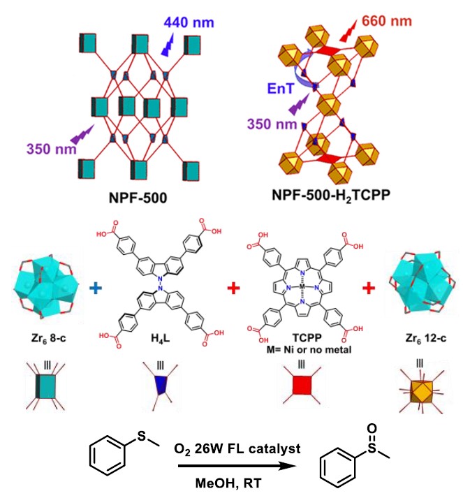 能量转移(EnT)是光化学合成中的一个关键过程,其对太阳能等可持续能源的开发利用具有重要意义。金属-有机骨架(MOFs)是一类新兴的多孔晶态材料,由有机配体和金属或金属簇节点自组装而成,为探索定向EnT现象提供了理想的研究对象。然而,在原子级精确调控的层面将能量供体和受体部分放在同一框架材料内是合成上的一个重大挑战。在这项工作中,报道了一种高度多孔和高光活性的N,N′-双咔唑和卟啉基混合配体MOF材料(NPF-500-H2TCPP)的设计和合成。其中,卟啉四羧酸配体H2TCPP与N,N′-双咔唑四羧酸配体分别与八面体金属锆簇的开放金属位点精确结合,形成(4,8)连接的三维pfm拓扑网络结构。文章以苯甲硫醚的光催化氧化反应为例,采用瞬态光谱分析证实了从N,N′-双咔唑配体到卟啉配体的高效EnT过程。该研究结果不仅证明了该材料可以作为精确构建给体-受体组装的框架材料,进而实现高效EnT过程;同时也指明了可直接利用EnT过程进行光催化化学反应的应用潜力。
