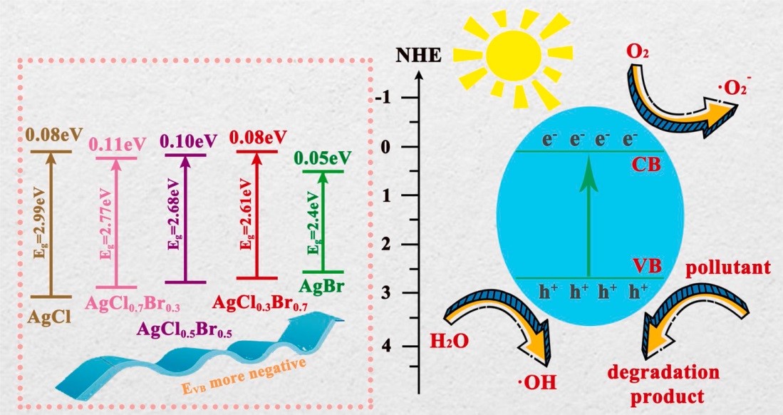 该项工作设计合成了一种带隙可调的新型的AgClxBr1-x固溶体光催化剂材料。通过调控Br/Cl摩尔比,AgClxBr1-x可实现从2.40到2.99 eV eV可调带隙。模拟阳光下,AgCl0.3Br0.7固溶体对Cr6+的还原和双酚A的氧化均具有最有效的催化活性,去除Cr6+的表观量子效率(QE)可达到42.8%,比AgCl(QE=4.0%)高出10.7倍。对于双酚A的催化氧化,反应100分钟,TOC的去除率达到66.8%。固溶体光催化活性显著提升归因于较窄带隙、高表面积以及有效抑制光生载流子复合。