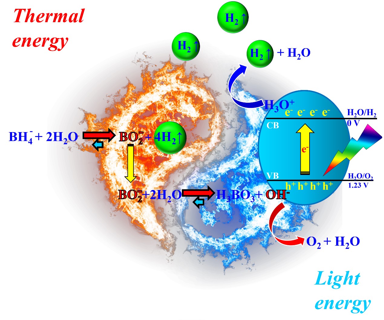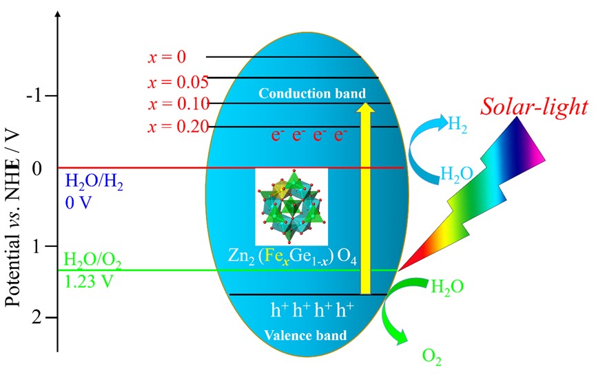 本研究根据所在课题组的前序研究Zn2GeO4“光-热协同”驱动NaBH4催化水解释氢的启发,发现由于Zn2+离子半径过大,与Ge4+离子电荷数过高,因而Zn2GeO4较难实现过渡金属离子的有效掺杂。本研究转向同样具备d10电子构型的Ga3+离子所构建的ZnGa2O4。第一过渡周期的金属离子普遍具备与Ga3+离子相近的离子半径,因而可以通过“同晶置换”的策略,完成少量过渡金属离子的有效掺杂,达到能带精准调节的目,最终实现在可见光驱动下的NaBH4的“光-热协同”催化释氢作用。本研究发现Fe3+不仅能够有效地掺杂进入ZnGa2O4晶格内,还可以精准调节材料的能带,实现了在可见光和加热共同作用下针对NaBH4的高效协调催化性能。