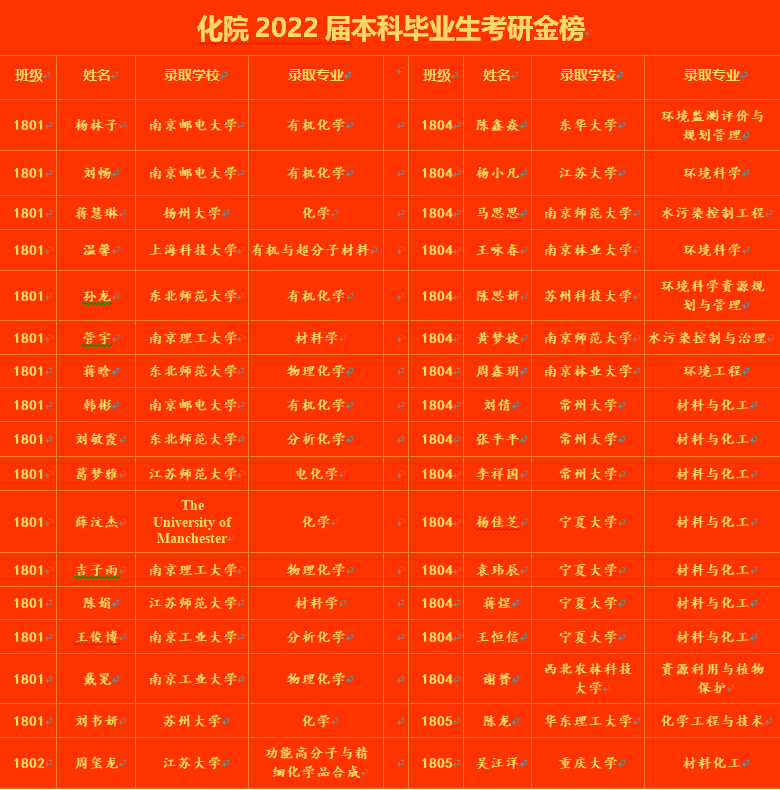 据悉,79名同学均被国内一本高校录取,其中37人被重庆大学、西北农林科技大学、华东理工大学、南京理工大学、上海大学、东北师范大学、苏州大学等985、211及双一流高校录取,1人被英国曼彻斯特大学(The University of Manchester,2021QS世界大学排名第27名)录取,人生发展迈上新台阶。1802班(应用化学专业)和1805班(化学工程与工艺专业)考研升学率均超过50%,分别为51.9%和51.7%;1804班(环境科学专业)和1801班(化学师范专业)考研升学率分别为48.4%和47.1%;1806班(化学工程与工艺专业)和1803班(应用化学专业)考研升学率分别为38.5%和37.5%。