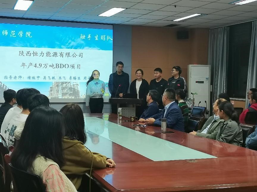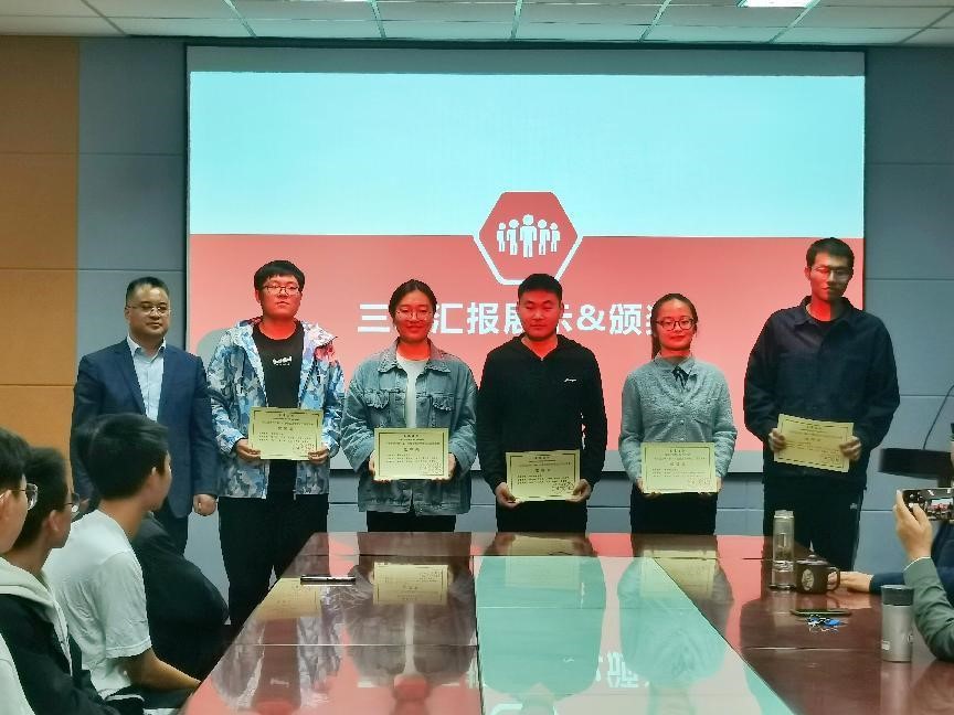 在本次见面会上,化工设计协会还邀请了在今年八月份举行的“天正设计杯”第十六届全国老员工化工设计竞赛中荣获国家二等奖的“触手生醇”团队进行汇报展示。全国老员工化工设计竞赛是我国化工专业认可度和参与度最高的学科竞赛,通过本次汇报展示,让化工专业新生们领略到化工专业的工程设计之美,感受到了学长学姐风们的自信,极大的激起了同学们的专业学习兴趣和热情。之后,周守勇经理为获得国家二等奖和三等奖的团队颁奖。