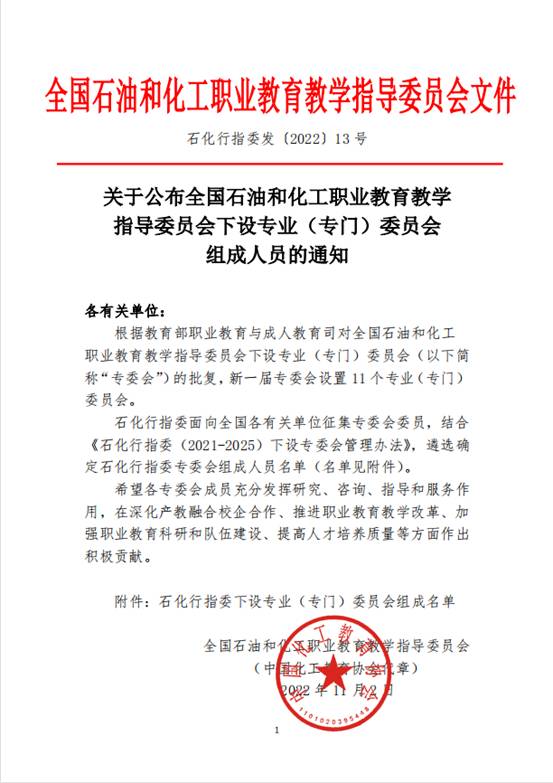 近日,全国石油和化工职业公司产品指导委员会下发《关于公布全国石油和化工职业公司产品指导委员会下设专业(专门)委员会组成人员的通知》,yd222云顶线路检测李梅生、吴飞跃两位老师当选石化行指委专委会委员。