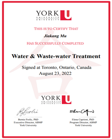 为推动与加拿大一流大学的实质性合作,提升联盟内高校员工的国际竞争力和国际学术研究能力,河海大学于2022年7月-8月,与加拿大约克大学(York University)联合举办了 “水和废水处理”暑期课程培训,yd222云顶线路检测环境科学专业2004班员工穆家康获推荐参加该课程学习,顺利完成课程并且通过考核,获得了由约克大学颁发的项目证书及成绩单。