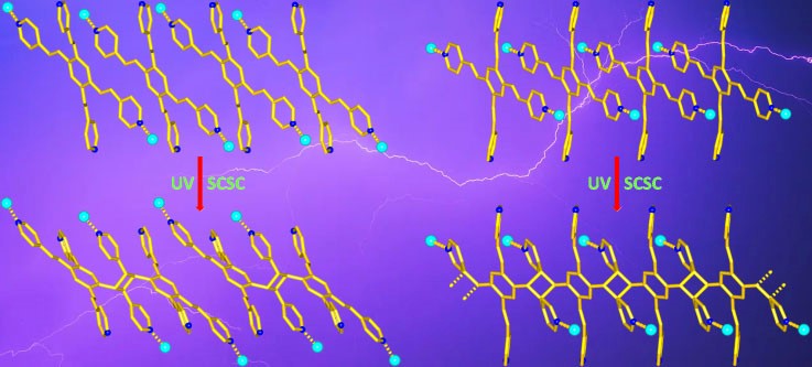 高效、高选择性共价反应一直是合成化学追求的目标。与传统溶液反应相比,基于晶态物质的固相反应在选择性及反应速率方面具有显著优势。然而,如何将具有反应活性的分子有序排列,使它们发生定向反应仍是目前面临的挑战。本论文基于配位自组装,通过调节辅助配体调控烯烃分子在配位聚合物中的排列模式。受到紫外光的照射后,两种配位聚合物中的烯烃分子分别发生二聚反应和聚合反应,形成二聚小分子及多聚高分子。该研究为高效、高选择性共价反应,特别是规整高分子聚合物的设计和制备提供了独特方案。
