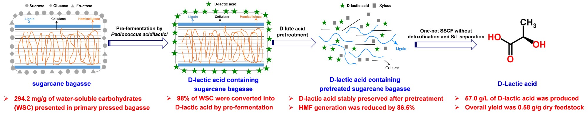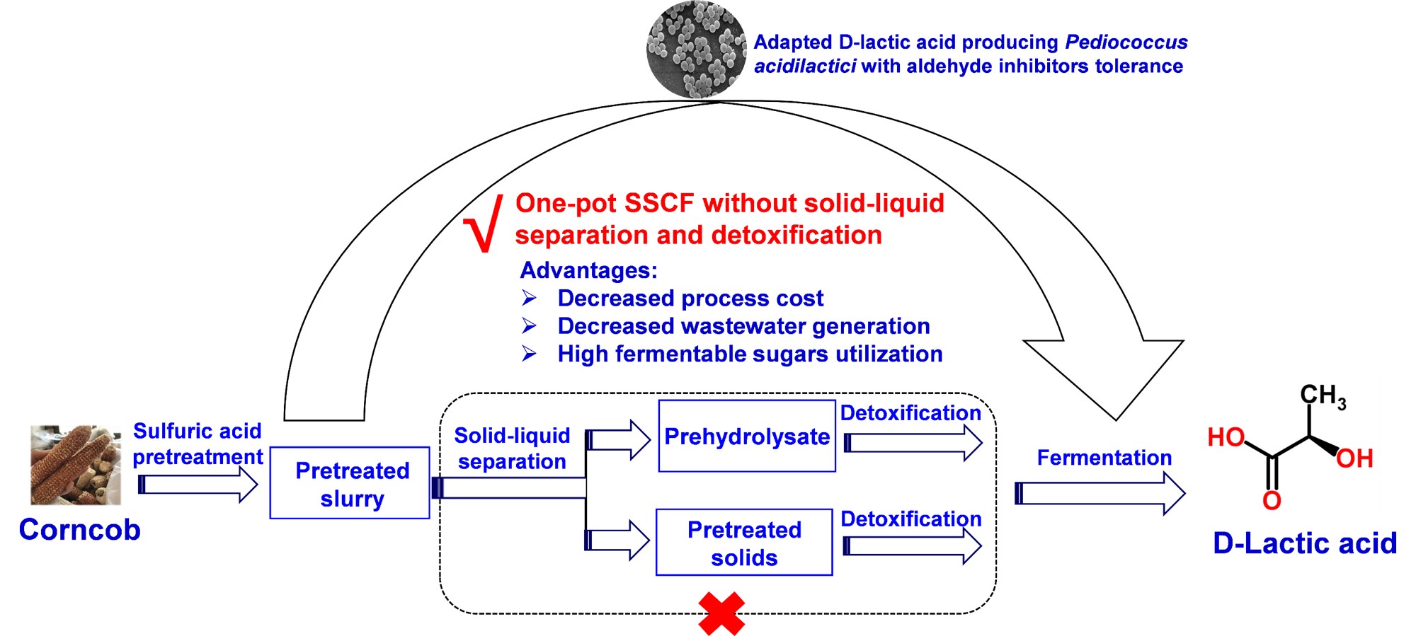 利用价格低廉的木质纤维素生物质替代淀粉质原料发酵生产手性乳酸单体,将降低生物可降解型塑料聚乳酸的生产成本。然而,木质纤维素预处理过程中产生的诸多抑制物(如HMF、糠醛、酚醛类等)会抑制乳酸生产菌株的生物活性,造成乳酸发酵指标不佳。文章1通过长期适应性进化策略,显著提高了乳酸片球菌对四种典型醛类抑制物(HMF、糠醛、香草醛和4-羟基苯甲醛)的生物转化能力,从而实现了利用不脱毒玉米芯预处理液进行D-乳酸发酵。文章2通过将甘蔗渣中的可溶性糖在预处理前首先进行预发酵生成D-乳酸,然后再进行硫酸预处理的策略,使得抑制物HMF的生成降低了近6倍,另外,乳酸片球菌利用未脱毒的甘蔗渣原料进行发酵时,D-乳酸发酵浓度提高了71.7%。本工作对于利用木质纤维素生物质生产D-乳酸具有重要指导意义。