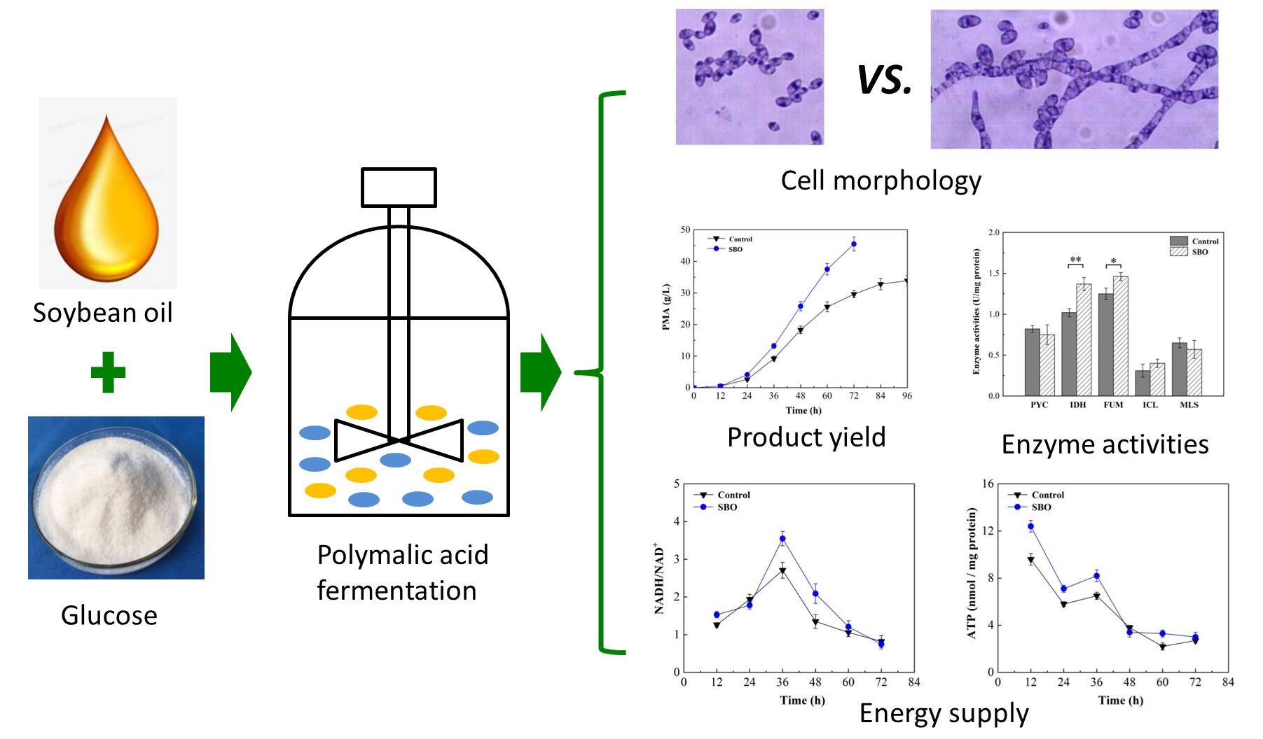 聚苹果酸是由出芽短梗霉(Aureobasidium pullulans)合成的高分子聚酯。本文研究了添加植物油对出芽短梗霉发酵的影响,结果显示添加植物油可以缩短发酵周期,提高产物浓度,菌体细胞被诱导呈现出酵母状细胞和丝状细胞共存的状态,细胞胞内ATP水平和辅因子水平明显上升。本研究为聚苹果酸的发酵代谢调控提供了重要参考。