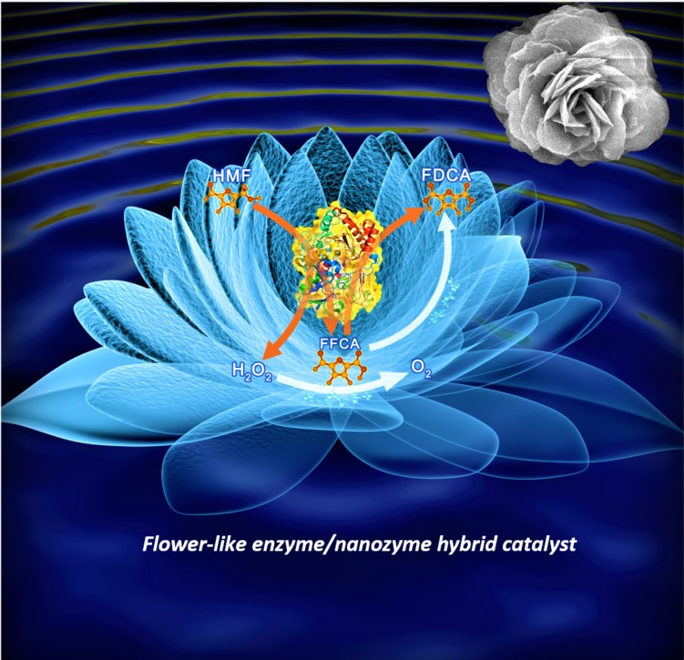 2,5-呋喃二羧酸(FDCA)是一种重要的生物基平台化学品,可用于生产聚乙烯呋喃酸酯(PEF)和其他有价值的呋喃类绿色化学物质。利用不同氧化还原酶进行环保的酶级联反应,5-羟甲基糠醛(HMF)多步氧化可合成FDCA。然而,天然氧化还原酶在级联反应中的协调较为困难。本研究通过设计血红素肽(HP-7)复合物与天然芳醇氧化酶(AAO)在磷酸铁溶液中杂交开发出一种高效的催化剂,实现HMF级联氧化为FDCA。基于AAO对苄基醇的氧化性,HMF首先转化为5-甲酰呋喃羧酸(FFCA);然后由HP-7@Fe3(PO4)2纳米酶激活AAO对FFCA的潜在氧化活性,与此同时原位消耗过氧化氢。此外,进一步研究表明,无论过氧化氢存在或不存在的情况下,HP-7@Fe3(PO4)2纳米酶对FFCA都具有氧化性。因此,杂化催化剂AAO/HP-7@Fe3(PO4)2通过整合多反应过程,使HMF能够自活化和高效氧化,最终HMF对FDCA具有完全选择性转化(100%)。
