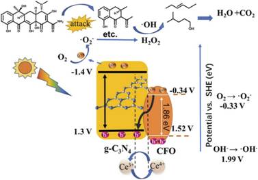 该工作采用原位聚合法制备了z型多孔氮化碳(CN)包覆的Ce-Fe双金属氧化物(CN@CFO)。小尺寸的CFO均匀锚定在CN层结构中。在耦合过程中CN和CFO之间的强相互作用形成异质结。该CN@CFO在21 min内对四环素(TC)的最大降解率为91.5%,在较少催化剂用量(0.125 g/L)的条件下,比纯CN的降解速度快2.4倍。ESR和自由基捕获结果表明,CN@CFO的活性物质主要是超氧自由基。与CFO相比,CN@CFO的结构增强了催化剂在酸性溶液中的稳定性,显著降低了Fe浸出率。