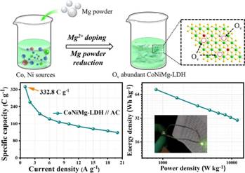合理设计层状双氢氧化物(LDH)电极对高性能超级电容器具有重要意义。该工作通过牺牲镁的置换反应,在室温下合成了具有丰富氧空位的超薄钴-镍-镁层状双氢氧化物(CoNiMg-LDH)纳米片。镁的自掺杂和还原性可以显著提高CoNiMg-LDH中氧空位的浓度,促进电化学电荷转移效率,增强电解质的吸附能力。组装的不对称超级电容器CoNiMg-LDH//AC,在1A/g的电流密度下实现了333 C/g的高比容量,在20 A/g的高电流密度下,循环5000次后仍然可以保持87%。这一工作发现了镁在调节氧空位以提高超级电容器性能方面的积极作用。