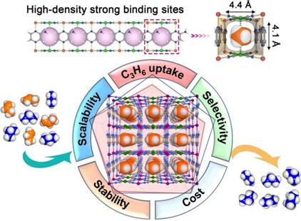 开发同时具有优异分离性能、高稳定性和易于合成三者相结合的用于丙烯/丙烷分离的多孔材料面临着重大挑战。此工作采用氨基吡嗪、二价镍和二价钴等组装得到了一种稳定的霍夫曼构型的配位聚合物材料(ZJU-75a),该材料具有高密度的强结合位点,可同时具备上述三个特点。ZJU-75a具有大的丙烯吸附量,其存储密度达到破纪录的0.818g·mL-1,同时在296K和1bar下还表现出很高的丙烯/丙烷选择性(54.2)。单晶结构分析表明,ZJU-75a中高密度的氨基结合位点不仅提供了很强的丙烯相互作用,而且可使丙烯在材料孔道中高密度堆积。在丙烯/丙烷混合气体的穿透实验中也同时表现出高的分离因子(14.7)和丙烯高吸附量(2.79mmol·g-1)。此外,该材料稳定性高,可通过绿色合成方法实现在公斤级规模下简便生产,有望成为解决工业丙烯/丙烷分离这一重大挑战的潜力材料。