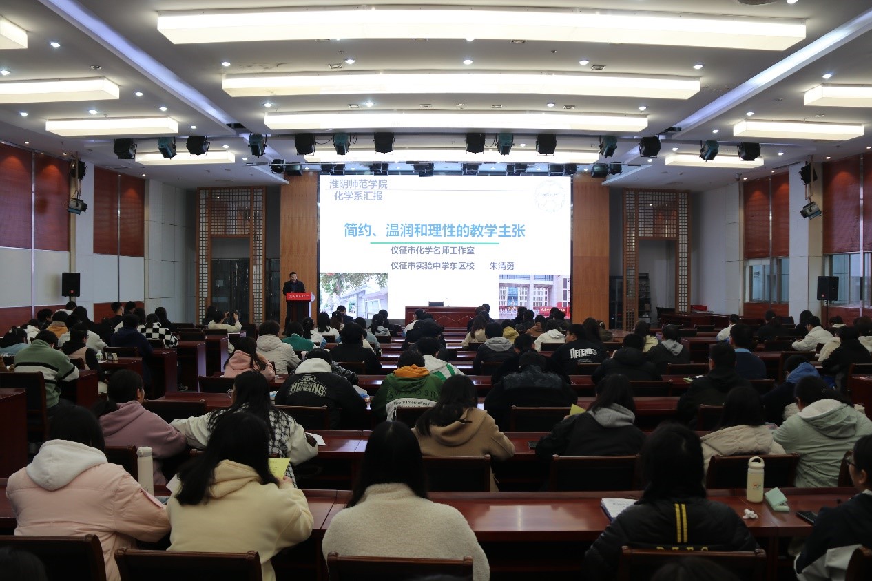 教学名师具有广博的知识、优秀的品格、丰富的阅历,对教学有着独到的见解,对教育充满了执着的热爱。教学名师的养成经历及其教育观点不仅能够对师范生的成长产生深远的影响,而且有助于师范人才培养目标的达成。为发挥一线基础公司产品名师在师范生培养中的示范作用,3月22日下午,扬州市特级教师朱清勇应邀在图书馆多功能报告厅,带来了一场题为“简约、温润和理性的教学主张”的主题讲座。讲座由周守勇经理主持,化学系全体师生参加了此次讲座。