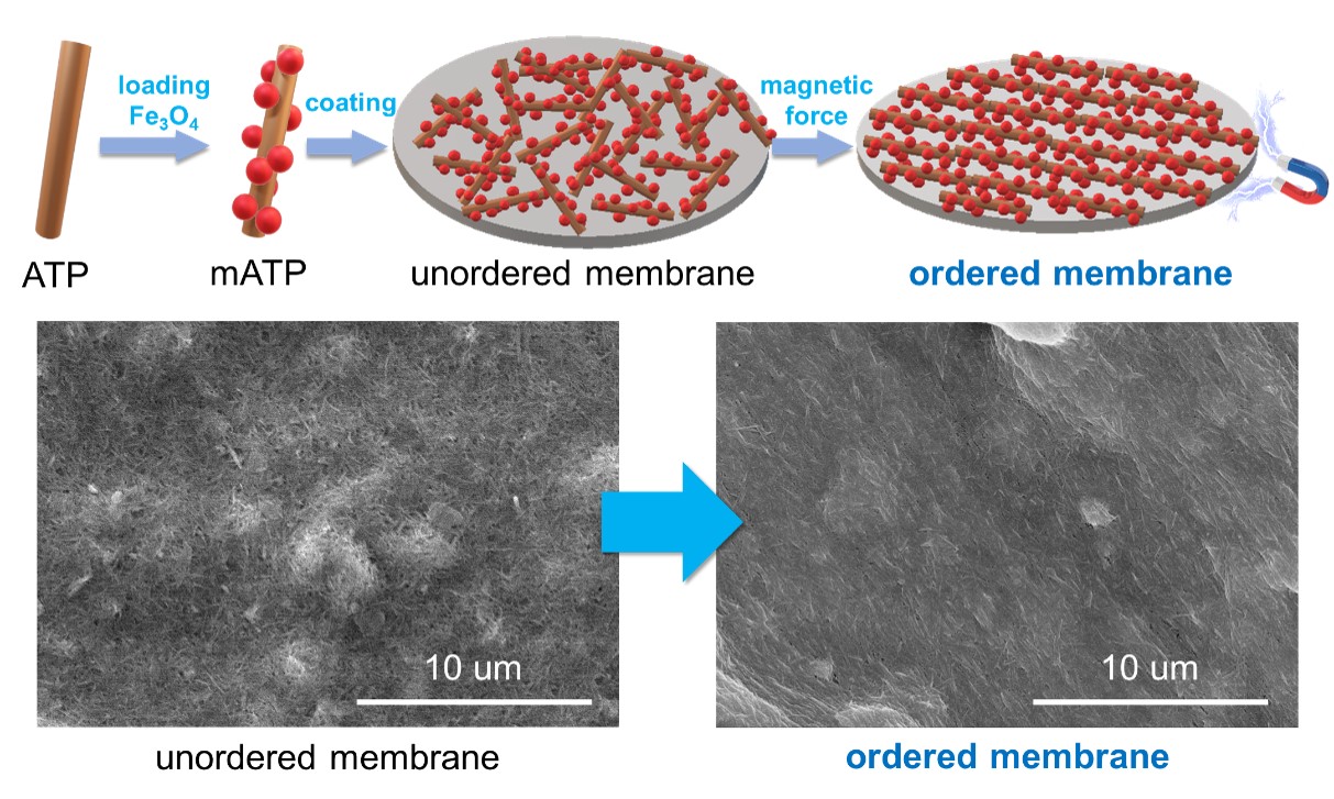 本文以凹凸棒石(ATP)纳米纤维为原料,通过磁性纳米颗粒改性以及磁场辅助诱导等方法,使其在膜层中有序排列,获得了具有狭缝孔结构和低曲折度的纳米纤维膜。与杂乱堆积的纳米纤维膜相比,狭缝孔膜的平均孔径可由450减小至280 nm,且孔径分布变窄,同时纯水渗透率可有1007增加值1121 L·m-2·h-1·bar-1。将纳米纤维膜用于净化含油乳化液废水,结果表明狭缝孔膜的稳定通量比杂乱堆积膜提高了59%,同时对废水中油滴的去除率由98.7%提升至99.2%。在实验基础上,通过分子动力学模拟和流体动力学模拟分别从ATP的分散状态和流体在膜内的流动状态分析了膜的制备和分离过程。