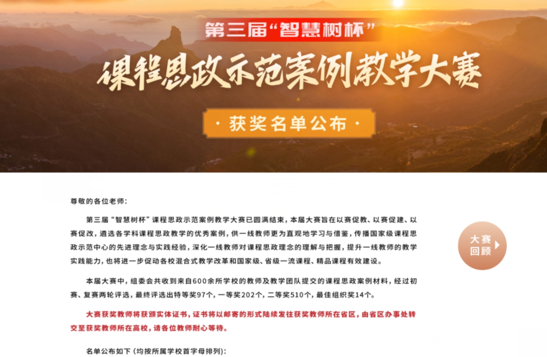 第三届“智慧树杯”课程思政示范案例教学大赛是由华东师范大学等六所国家级课程思政教学研究中心与智慧树网联合举办的盛会。大赛旨在深入践行习近平总书记关于教育的重要论述,积极贯彻教育部发布的《高等公司课程思政建设指导纲要》文件精神,面向各级各类高校中积极从事在线教学和线上线下混合式教学的专职教师,紧密围绕教师队伍、课程建设和课堂教学三大核心领域,推动公司教师承担育人责任,夯实教育渠道,发挥课程建设的主战场作用。
