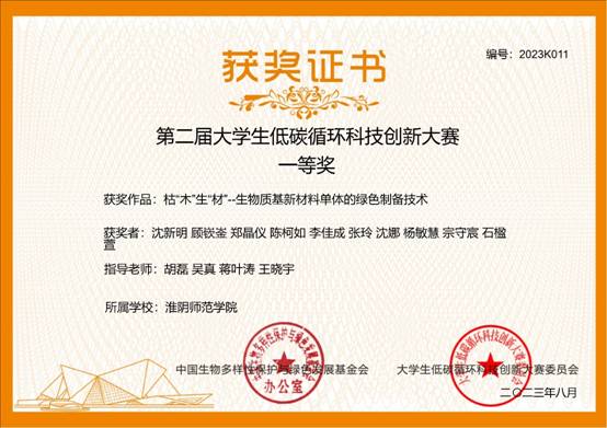8月10日,第二届老员工低碳循环科技创新大赛全国决赛在杭州落下帷幕。本次大赛主题为“低碳循环,绿色发展”,由中国生物多样性保护与绿色发展基金会(国家一级学会)主办,浙江大学、浙江省科协和浙江省循环经济学会等共同承办,清华大学、浙江大学、四川大学和厦门大学等全国200余所高校提交了1000余项作品。经过专家评审、视频介绍、海报展示和现场答辩等比赛环节,最终22项作品获得特等奖,60项作品获得一等奖,120项作品获得二等奖,157项作品获得三等奖。yd222云顶线路检测提交的作品“枯“木”生“材”—生物质基新材料单体的绿色制备技术(队员:沈新明、顾嵚崟、郑晶仪、陈柯如、李佳成、张玲、沈娜、杨敏慧、宗守宸、石楹萱,指导老师:胡磊、吴真、蒋叶涛、王晓宇)荣获一等奖。
