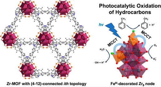 异相催化在化员工产和能源转换中起着不可或缺的作用。常见的策略是将过渡金属掺入金属氧化物和沸石,以微调生成的固体催化剂的活性和选择性。而通过后合成的方法在金属-有机框架(MOFs)中以过渡金属修饰金属-氧簇,为构建精确的结构模型,并更深入地理解反应机制提供了一种合理的策略。在本研究工作中,报道了一个新的(4,12)连接的锆基MOF的设计和合成,该MOF具有罕见的Zr9节点。FeIII被进一步掺入到该框架的Zr9节点中,得到的MOF材料对甲苯的光催化氧化表现出显著增强的活性和选择性。这项工作展示了一种巧妙的配体设计策略,用于控制Zr-氧簇的核性,进一步调节了过渡金属的数量、结合位点以及对C-H活化的总体光催化活性。该工作为构建模型系统以理解结构-活性关系铺平了道路,从而拓宽了MOFs在化学和光化学催化中的应用途径。