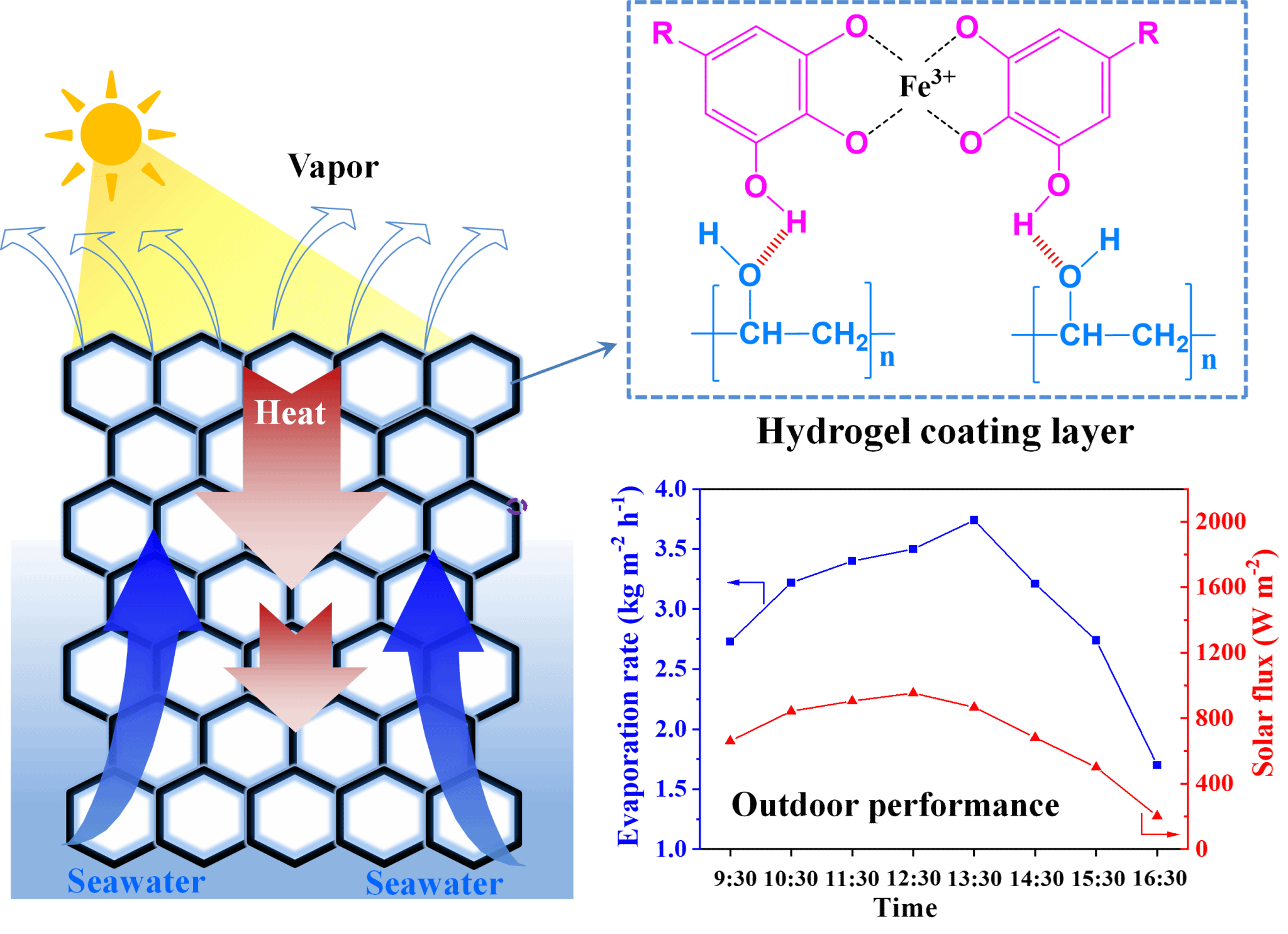 设计了一种简便、快速、易于大面积构建的亲疏杂化水凝胶涂层。该涂层由单宁酸(TA)、炭黑(CB)和聚乙烯醇(PVA)形成的3D水凝胶网络及表面沉积的Fe3+组成。一方面,TA作为表面改性剂可以显著改善CB表面浸润性,提高CB在PVA中的分散性;另一方面,PVA与TA之间通过氢键交联得到3D网络结构水凝胶,解决了冻融法制备水凝胶需消耗大量时间和能量的问题。通过CB和Fe3+的协同作用,可以高效的捕获太阳光并将太阳能转化为热能。同时,水凝胶网络和泡沫的骨架保证了水的持续供给和快速运输。因此,水凝胶涂层泡沫表现出优异的光热性能,在1 sun的模拟太阳光照射下,水蒸发率达到3.64 kg m-2 h-1。由于水凝胶的强水化性和多孔泡沫的大孔隙率,水凝胶涂层泡沫展现出优异的抗污染性和耐盐性。在8 h的模拟海水连续蒸发实验中,没有出现盐结晶问题。该方法为高性能太阳能水纯化材料的制造和设计提供了一种新的途径,有助于解决世界水资源短缺问题。