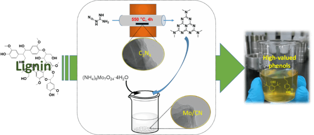 木质素的复杂结构和异质性限制了其高效利用,破解木质素的抗降解屏障成为研究热点之一。本研究以钼酸铵和双氰胺为原料,采用两步法合成氮化碳负载钼催化剂(Mo/CN)并用于催化木质素解聚制备高值酚类化合物。催化反应过程中,超氧阴离子自由基(•O2-)引发木质素超氧化物阴离子形成,并导致木质素苯环侧链断裂,最终实现了木质素到4-丙基愈创木酚和抗氧化剂丁基羟基甲苯(BHT)的高选择性转化。本研究为工业木质素的综合利用以及抗氧化剂BHT的高效制备提供了新的思路。