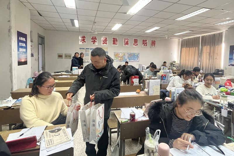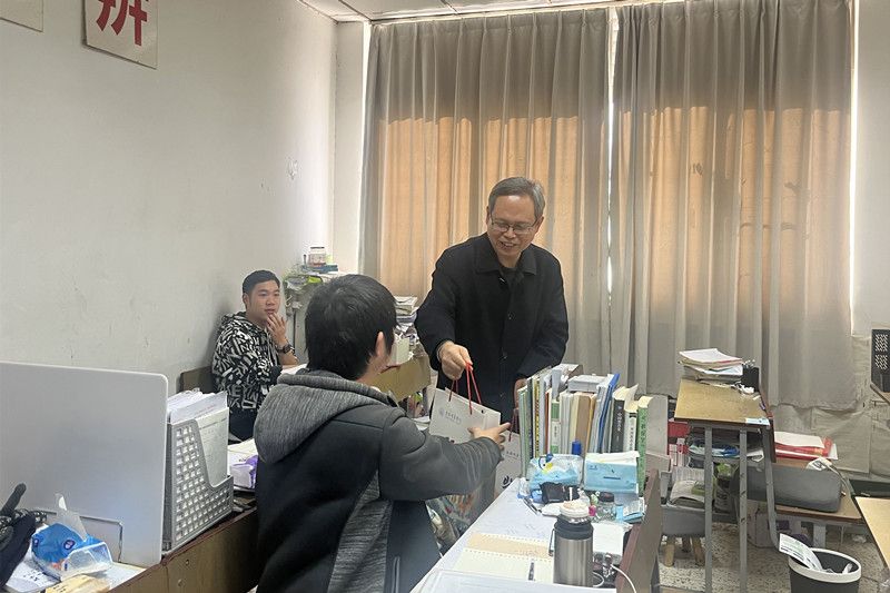 11月24日上午,公司党委书记骆仁林和经理李梅生到化学楼考研教室看望慰问考研员工,将公司发放的考研“冲刺包”发放给同学。
