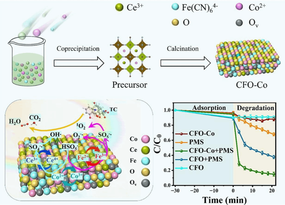 提高电荷传递效率和加速氧化还原循环是提高催化剂活化过氧单硫酸盐(PMS)能力的有效途径。在此基础上,成功构建了钴调控的铈铁氧化物。钴掺杂显著减小了铈铁氧化物(CFO)的粒径,增加了氧空位的浓度,进一步提高了电荷传递效率,加速了氧化还原循环,生成了更多的活性氧(ROS)。因此,CFO-Co表现出增强的PMS活性,可在3 min内降解71.2%的四环素(TC),速率常数可达0.39 min−1,是纯CFO的5.6倍。DFT计算表明,钴的引入可以显著降低PMS在催化剂上的吸附能,延长过氧键,促进PMS活化生成ROS。机理研究表明,反应产生的单线态氧和超氧自由基是主要活性物质。并对其可能的降解途径和毒性进行了分析。