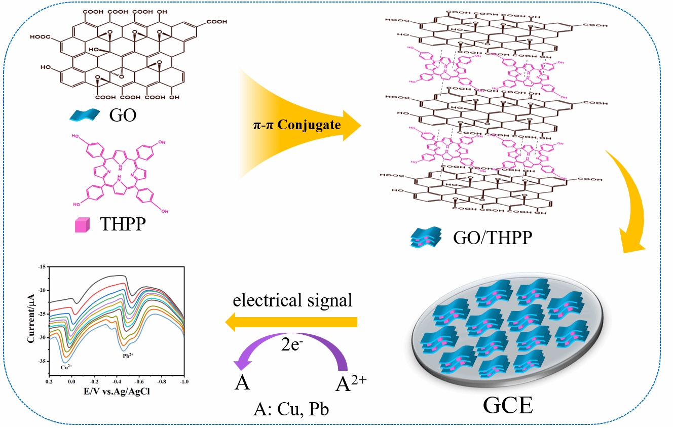本研究工作通过π-π非共价作用将氧化石墨烯功能化,与5,10,15,20-四(4-羟基苯基)-21H,23H-卟啉(THPP)复合得到GO/THPP纳米复合材料,并将其修饰到玻碳电极构建一种电化学传感器,用于同时检测污水中的Cu2+和Pb2+。由于GO的高电子迁移率和THPP优异的给电子性能,在GO纳米片上引入THPP可增加电子转移能力。该传感器作为电化学分析的新平台,在THPP和GO的协同作用下,对Cu2+和Pb2+的还原具有良好的电催化活性。Cu2+在5 - 300 μmol L-1和300 - 900 μmol L-1范围内呈两段线性响应,检出限为1.5 μmol L-1。Pb2+的两段线性范围为5 - 250 μmol L-1和250 - 900 μmol L-1,检出限为1.6 μmol L-1。此外,该传感器对一些常见的阳离子和阴离子具有良好的抗干扰能力。该方法已成功应用于同时准确检测污水中残留的Cu2+和Pb2+,在实际样品中的常规传感应用中具有广阔的应用前景。